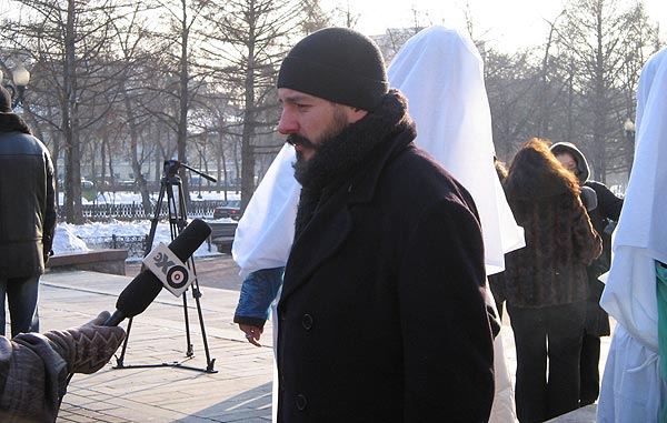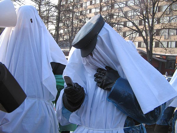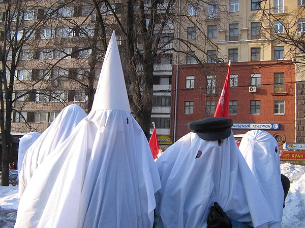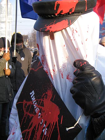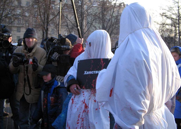 Собравшиеся стояли под плакатами "Путин, прикрой коммерческую лавочку", "Долой строительство по-лужковски" и "Объединенную правительственную группировку - под суд". Художники-участники акции устроили театрализованное представление: переоделись в белые балахоны, изображая чиновничьи пороки - лживость, скудоумие, алчность. Они постригли барана и были немедленно расстреляны краской подоспевшими "бойцами народного контроля" . Действо символизировало борьбу с пороками московского правительства.