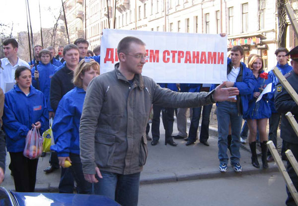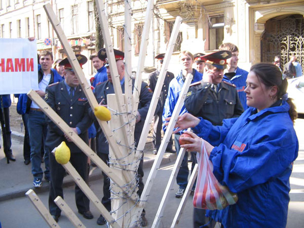 Со слов корреспондента Каспаров.Ru у здания консульства проходил несанкционированный митинг "Молодой Гвардии", молодежной организации единороссов. На глазах у журналистов они насадили на деревянный каркас в форме дерева несколько лимонов и яблок, пояснив, что это "символика их идеологических противников". После этого колонну молодогвардейцев потеснила милиция, и, по словам очевидцев, по ошибке задержала одного из них.