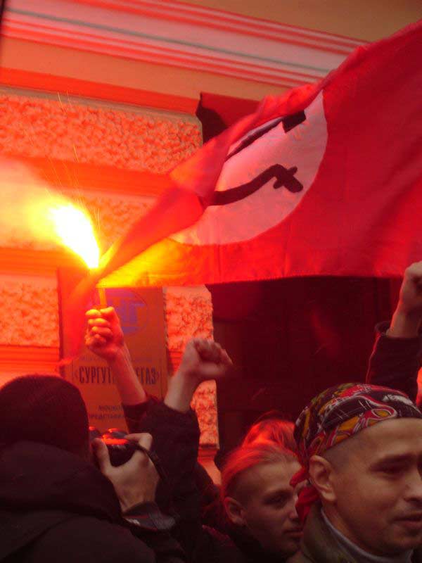 Нацболы попытались прорваться на второй этаж, однако им это не удалось. Охрана выгнала их из здания, при этом нацболам угрожали боевым оружием. Тем не менее национал-большевики устроили перед входом в офис пикет. Они растянули транспарант "Деньги – рабочим!", зажгли файера и начали скандировать: "Революция!", "Буржуев на нары, рабочих на Канары!".