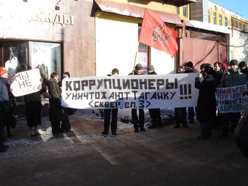 Противостояние жителей Таганского района Москвы с местными властями по поводу вырубки сквера и строительства торгового центра продолжается уже более двух лет. В сентябре 2005 года в знак протеста против незаконного строительства "Дженерал-центра" таганцы блокировали ворота мэрии и приковывались наручниками к железным ограждениям.