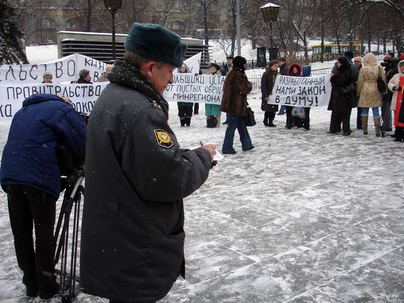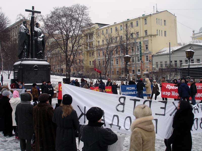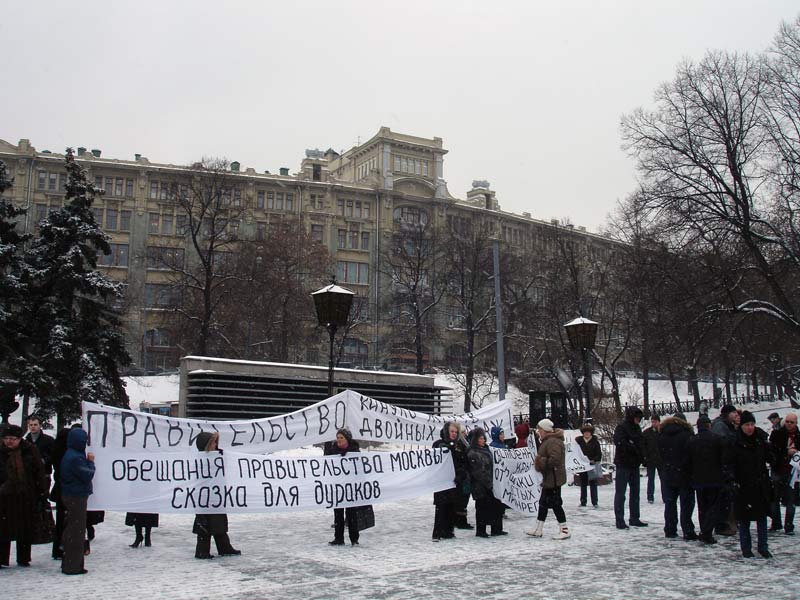 Участники акции скандировали: "Позор Ресину!", "Позор Лужкову". В руках они держали плакаты с лозунгами: "Дольщики устали от пустых обещаний", "Суды - не решение проблем дольщиков", "Обещания правительства Москвы - сказка для дураков", "Правительство кинуло жертв двойных продаж!"