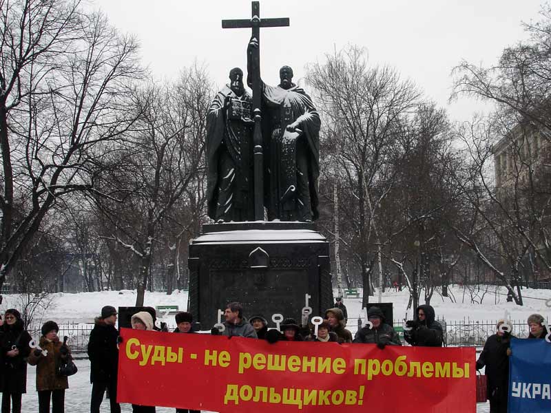 Выступления дольщиков на Славянской площади превратились в регулярное мероприятие. День назад 28 февраля на этом месте протестовали обманутые соинвесторы из города Щербинка, Московской области. В течении последнего года подобные протесты на Славянской площади происходили с регулярностью одной-двух недель.