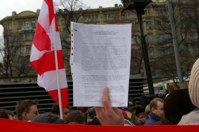 На митинге дольщики распространяли свое обращение, в котором призвали недовольных действующей властью граждан на выборах 11 марта портить избирательные бюллетени. Они заявили о начале новой акции, участники которой будут перечеркивать красной ручкой в своих бюллетенях список всех партий и писать "Нет коррупции власти". "Чем больше "красных бюллетеней" окажется в урнах, тем весомее будет наш сигнал о недоверии к власти", - говорится в обращении дольщиков.