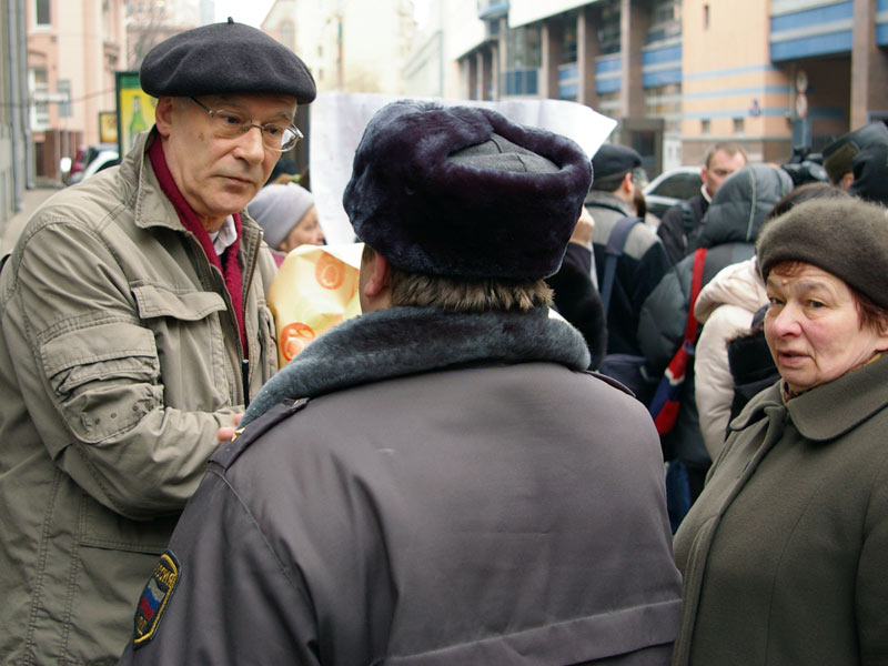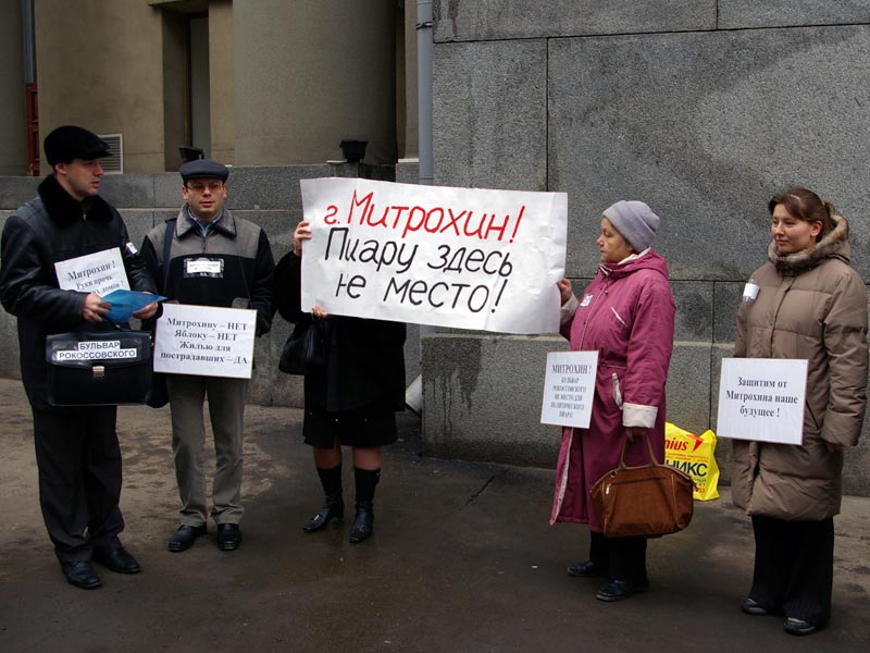 После получасового пикетирования на месте событий появились преставители инициативной группы, борющаяся с незаконной застройкой в охранной зоне Лосиного острова, которые попытались переубедить соинвесторов. У них с собой был лист бумаги, на котором они тут же написали лозунг: "Митрохин – наш депутат!". Милиция среагировала оперативно. Когда на листе появилась фамилия лидера "яблочников", сотрудник правопорядка предупредил: "Поднимете плакат, и я вас задержу". Так и вышло - одну жительницу задержали.