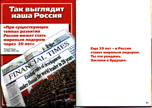 Если же подопытный объект блестящее проходил все необходимые тесты, ему обещали перезвонить. Попутно молодые сторонники политики Путина распространяли великолепные пропагандистские брошюры. Одна из них случайно попала ко мне в руки.