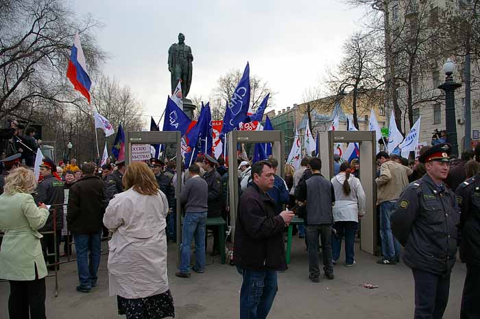 Около 20 представителей движения "Наши" в солдатской форме с логотипами "Наша армия" на спинах попытались пройти на площадь, но были остановлены ОМОНом на выходе из метро. Мимо площади пронеслась легковая автомашина с фанерной башней танка на крыше, на которой было написано: "Позор косякам!". Ее пассажиры, предположительно сами "нашисты", выкрикивали одноименный лозунг, высунувшись из окон автомобиля.