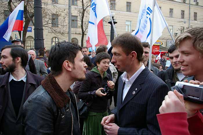 После "нашиста" слово взял Роман Доброхотов, лидер молодежной организации "Мы". Он сказал, что по его сведениям, выступавший "нашист" не служил в армии, следовательно, этот молодой человек и является трусом и предателем. Затем Доброхотов добавил, что было бы неплохо, если бы все члены движения "Наши", вместо того, чтобы периодически собираться на площадях столицы в количестве 20 тысяч человек, сами отправились бы служить в армию.