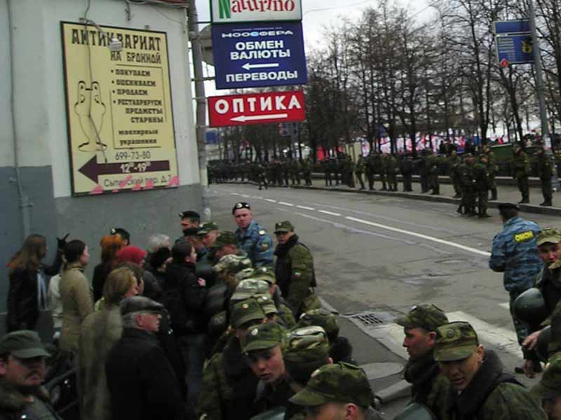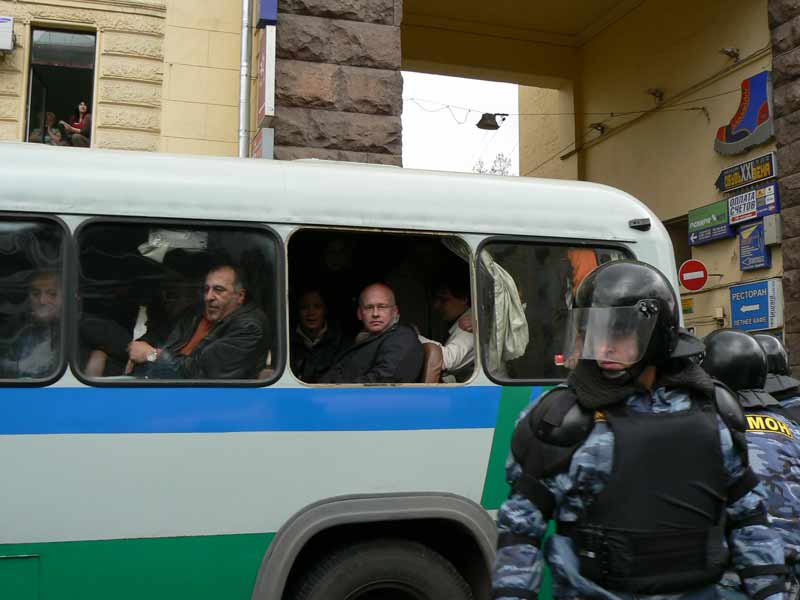 Напомним, что лидер ОГФ был задержан около 12 часов дня на Пушкинской площади, куда прибыли желающие пройти в мирном шествии от туда до Тургеневской площади. Он пробыл в отделении милиции более 5 часов. Милиция жестоко пресекла эту попытку, задержав, по разным оценкам, от 250 до 500 человек. Около ста человек пострадало от действий ОМОН как во время задержания на Пушкинской площади, так и во время акций поддержки задержанных участников марша. Только в травмпункт № 137, расположенный на Пресне, обратились за помощью 54 человека.