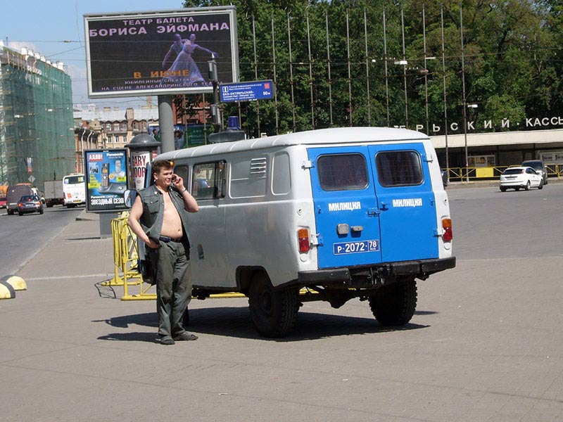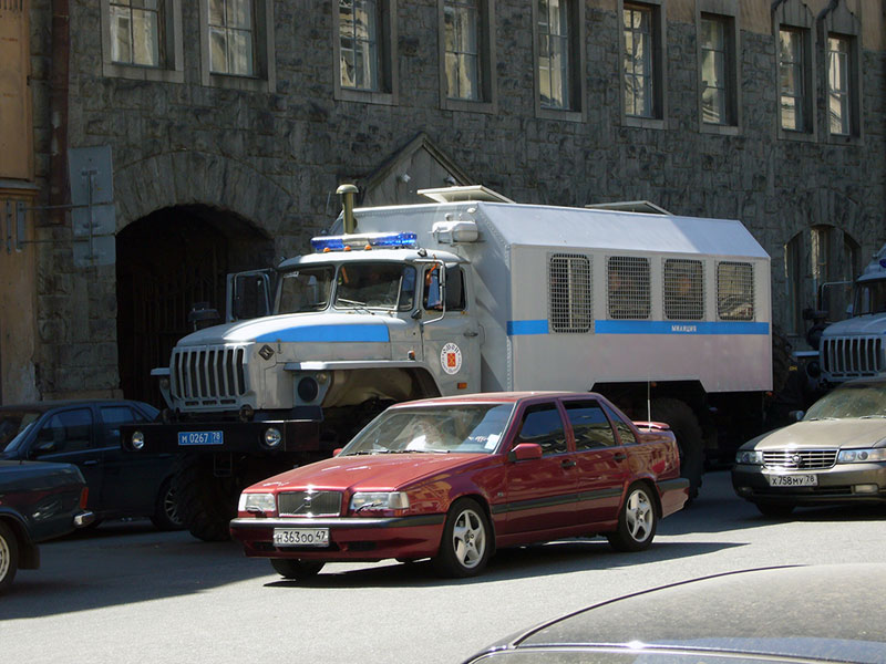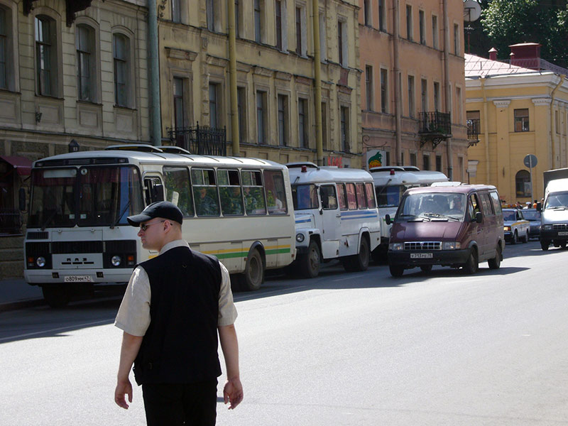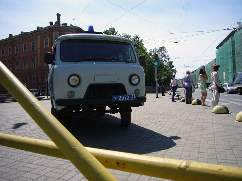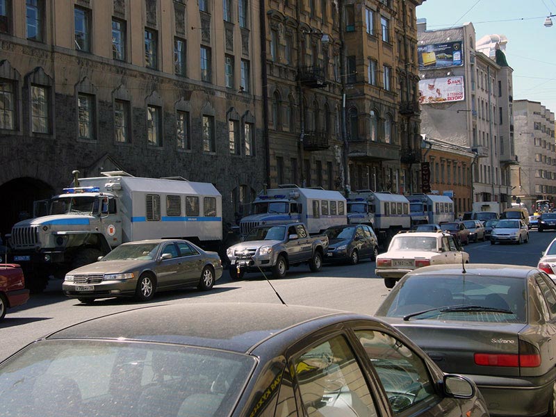 На углу этой же улицы – два микроавтобуса, в которых сотрудники милиции в штатском переодеваются в форму. Вдоль всего маршрута в переулках и во дворах стоят милицейские автобусы. Попадаются и легковые машины, явно принадлежащие все тем же правоохранительным органам, но без опознавательных знаков.
