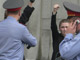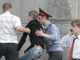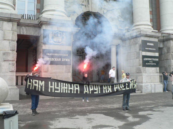 Два нацбола успели приковать себя цепями к бордюру возле входа в мэрию, после чего в воздухе вспыхнули фаеры. Остальные же участники акции в это время полностью перегородили вход в здание растяжкой с надписью "Нам нужна "Другая Россия"!