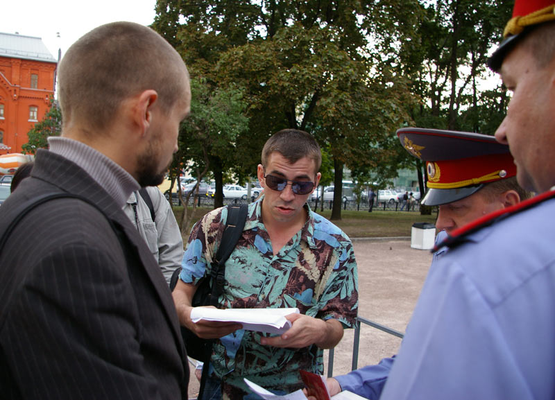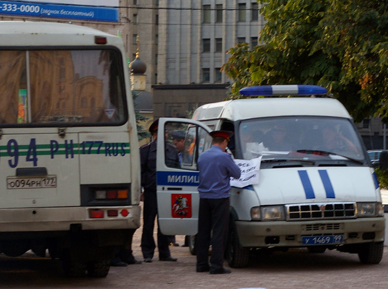 Место проведения пикета было оцеплено еще до начала пикета. Примерно через полчаса после начала акции было задержано пять человек: организатор пикета Сергей Константинов, Дмитрий Злотников, Юлия Башникова, Всеволод Чернозуб и Николай Борошенко. При задержании милиционеры отказались представиться и показать документы. Задержанных увезли в ОВД "Китай-город". Известно, что на пикете присутствовали пятеро сотрудников Федеральной службы безопасности в штатском.