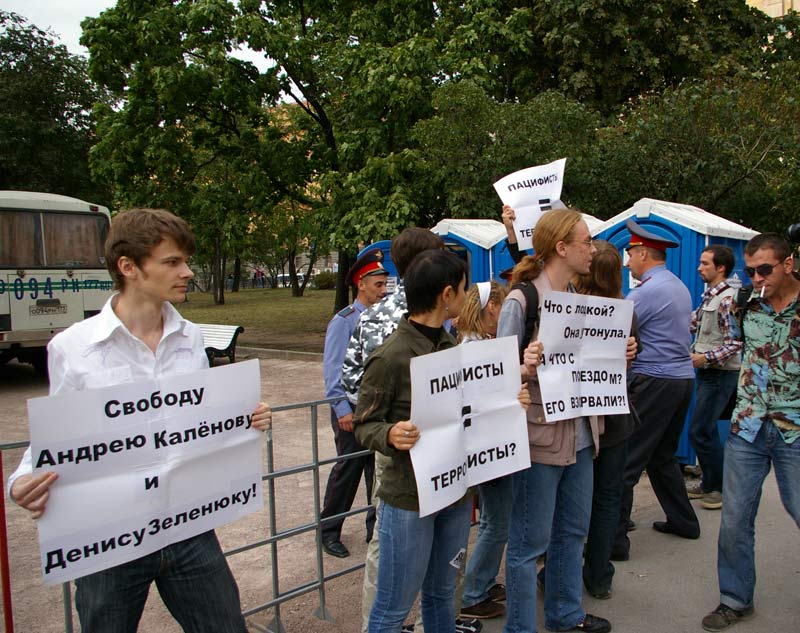 Пикет организован либертарным движением "Свободные радикалы". Помимо организаторов в нем приняли участие анархисты, представитель антивоенного клуба и молодежного правозащитного движения. Поддержать Каленова и Зеленюка пришли около 30 человек. Они принесли плакаты с лозунгами: "Пацифисты = террористы", "Лодка утонула, поезд взорвали", "Свободу Каленову и Зеленюку".