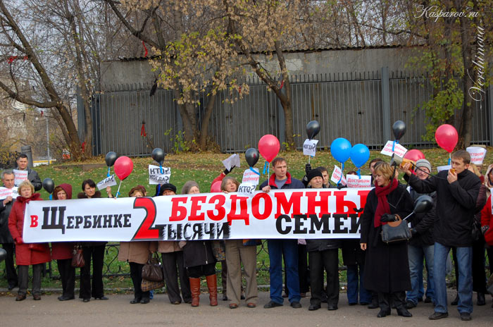 На митинге присутствовало 150 человек. Обманутые жители пришли с растяжкой "В Щербинке две тысячи бездомных семей", почти каждый держал в руках плакаты с надписями "Кто?", "Когда?". Люди скандируют "Зубков, помоги" и "Застройте Щербинку".