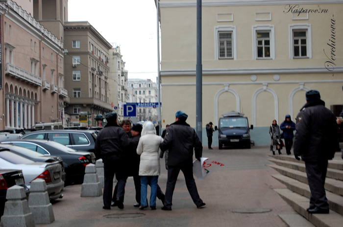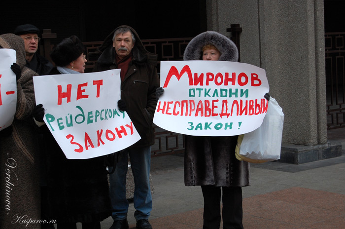 В мероприятии приняло участие около 20 человек. Участники пришли с плакатами: "Миронов, оттолкни несправедливый закон", "Олимпиада не повод для беспредела", "Миронов — несправедливая Россия", "Нет рейдерскому закону". Акция была не согласована с властями. Сразу после ее начала появился человек в штатском, запретивший журналистам снимать мероприятие. У главы московского отделения партии "Яблоко" Сергея Митрохина проверили документы. Задержана одна из участниц пикета Мария Штынько. Сейчас девушка находится в ОВД "Тверское", где стражи правопорядка составляют протокол об административном правонарушении.