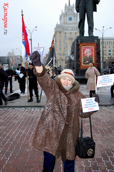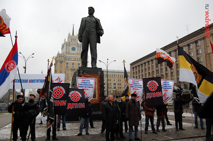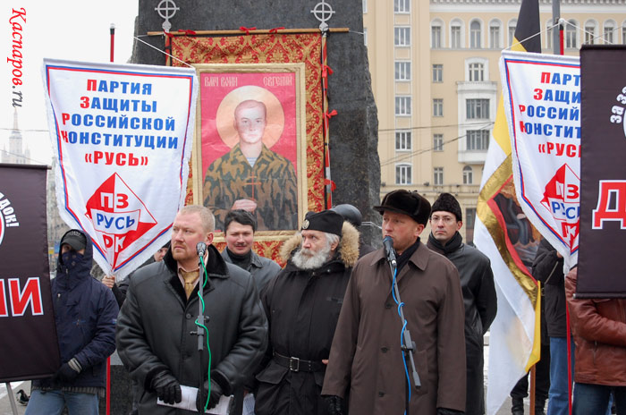 Представитель общества "Память" Георгий Боровиков заявил на митинге: "Нам нужна диктатура героя, а не этих мышей и крыс, год которых надвигается". Председатель исполкома партии защиты российской Конституции "Русь" Юрий Горский сказал: "Сегодня один из дней, когда мы вспомнили, что герои на Руси не перевелись, вам есть на кого ровняться". Собравшиеся много говорили о фальсификации выборов. Резолюцию митинга зачитал лидер движения "Русский порядок" Владимир Тор.