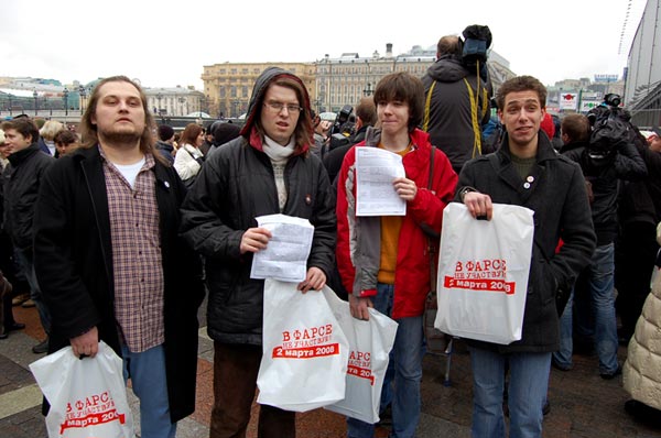 Участники акции, в том числе лидер ОГФ Гарри Каспаров прогуливались по площади с пакетами, на которых написано "В фарсе не участвую! 2 марта 2008". При появлении Каспарова Красная площадь была заблокирована ОМОНом. Он и еще 10 человек встали в очередь в Исторический музей с билетами на выставку "Учредительное собрание: 11 минут демократии в России". ОМОН заблокировал им дорогу. На площади находились несколько автобусов с бойцами ОМОНа. Была попытка задержать нескольких флэш-мобберов, но те потребовали от "силовиков" предъявить удостоверения и предоставить понятых, после чего "правоохранители" отказались от своего намерения.