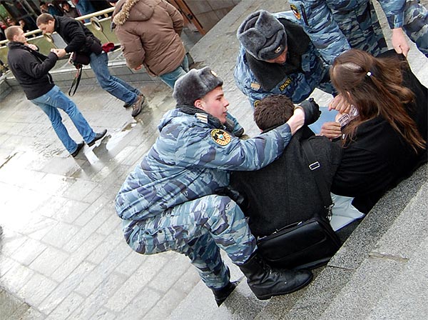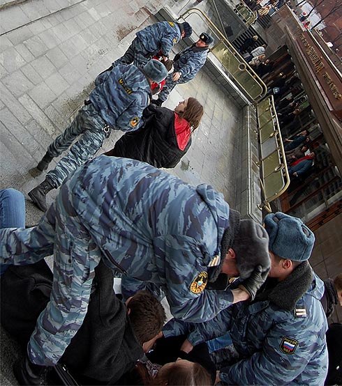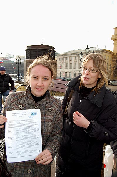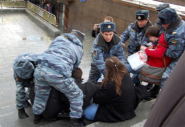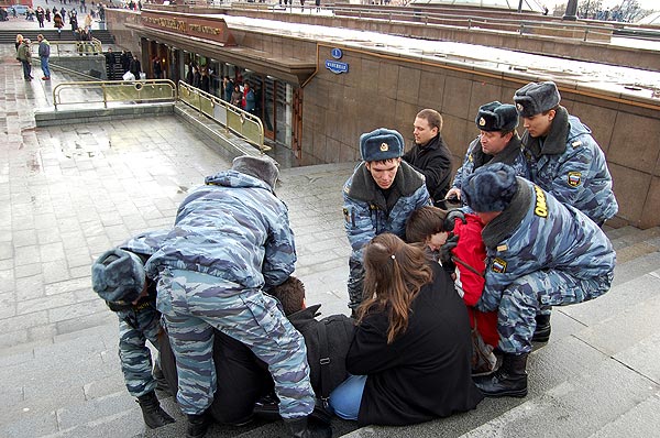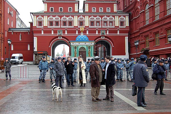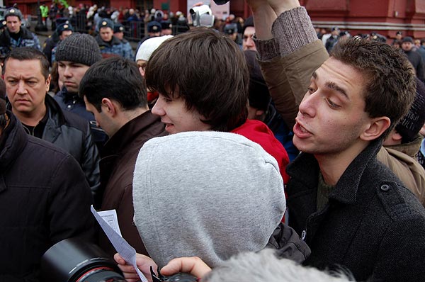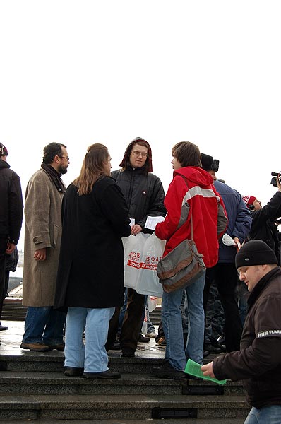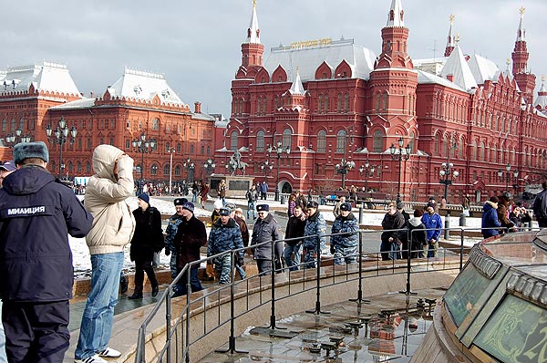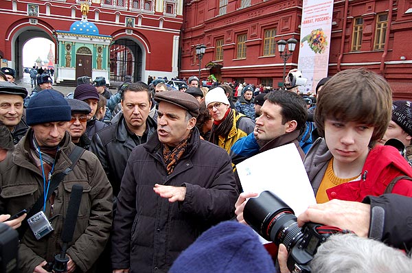 На площади также появился лидер "России молодой", депутат Госдумы Максим Мищенко. Он сказал, что "Каспаров хочет развалить Россию по оранжевому сценарию на деньги США", и пообещал провести вечером 2 марта пикет на Лубянке. Милиционеры потребовали от него уйти, обвинив в провокации.