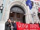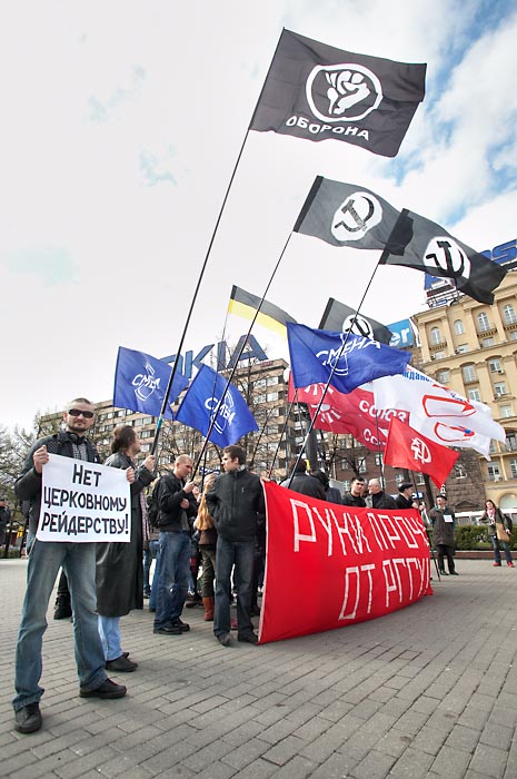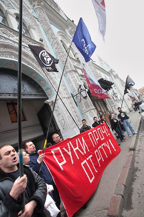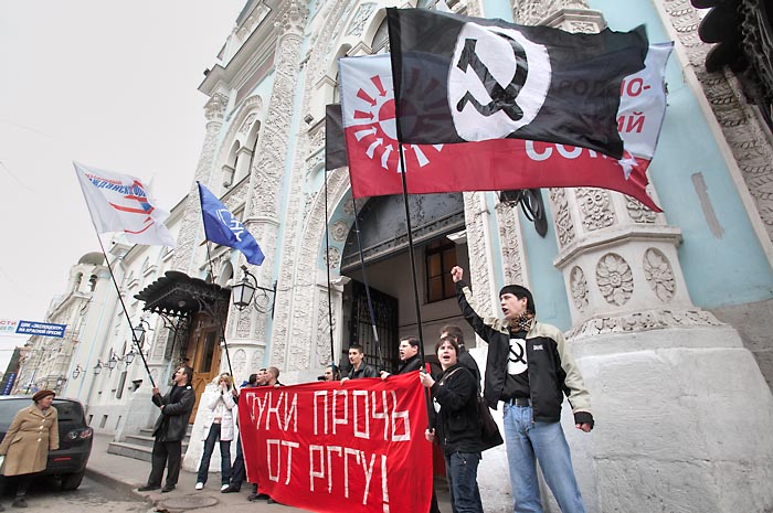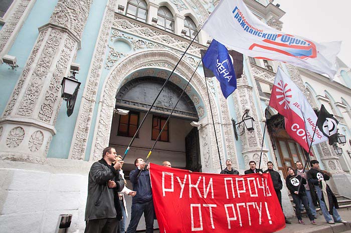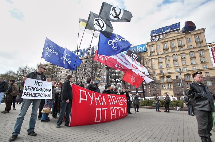 Участники пикета держали растяжку: "Руки прочь от РГГУ!", а также плакаты: "Не возжелай имущества ближнего своего!" и "Нет церковному рейдерству!".