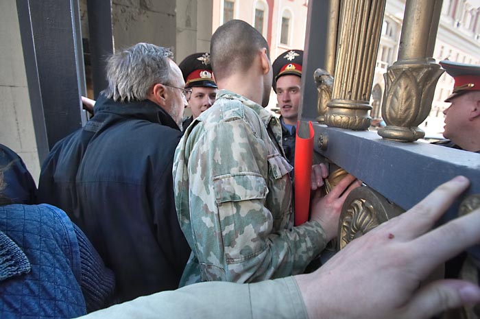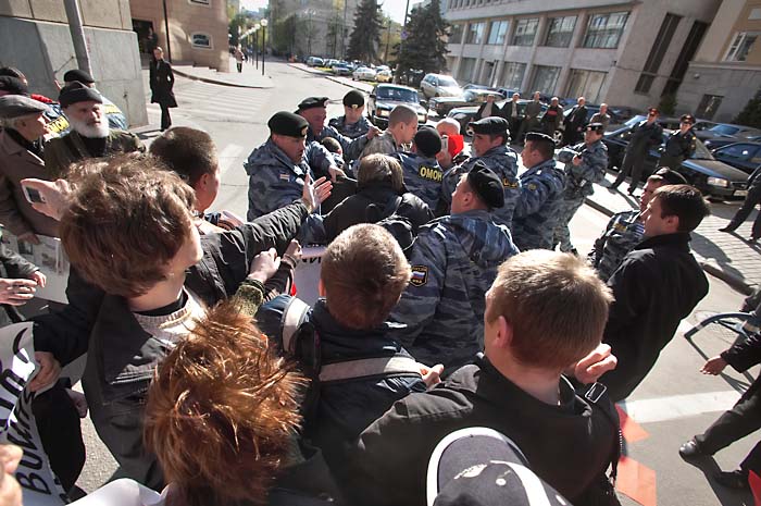 Группе, направлявшейся в сторону приемной мэрии преградил путь ОМОН. Граждане пытались сопротивляться задержанию, сцепившись кольцом. В адрес ОМОНа скандировали "Бандиты!" и "Милиция с народом! Не служи уродам!". Однако все участники были задержаны.