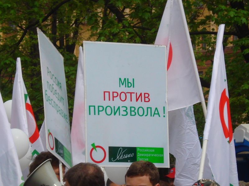 Кроме того, как во время шествия, так и во время митинга собравшиеся держали плакаты "Яблоко против произвола", "Свободу печати, радио, ТВ", "Позор карманным марионеткам: ТВ, басманным судам, депутатам ГД!", "Долой КГБ-шный режим".