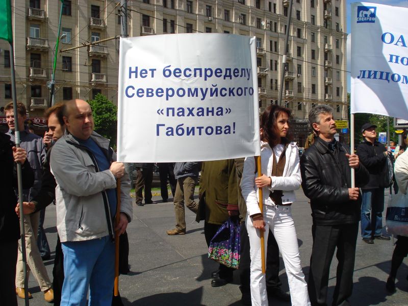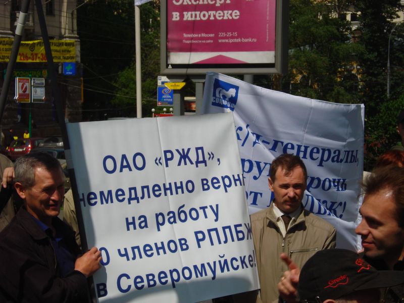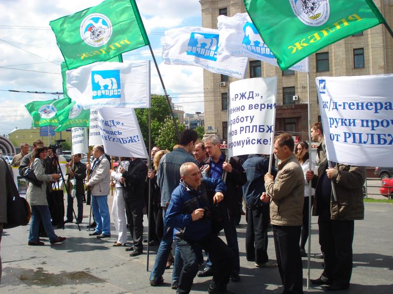 Железнодорожники держали плакаты: "Нет правовому нигилизму в ОАО "РЖД"!", "Руки прочь от РПЛБЖ!", "Нет беспределу северомуйского пахана Габитова!".