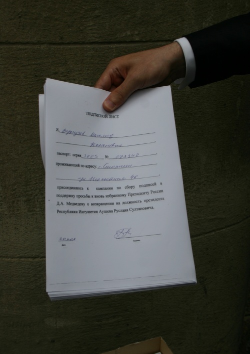 Напомним, с 1 июня 2008 года в Ингушетии началась подписная кампания, которая продолжается по сей день. В ходе нее было собрано 105 тысяч подписей жителей республики, но 25 тысяч было изъято сотрудниками УБОПа во время обыска в доме одного из активистов кампании.
