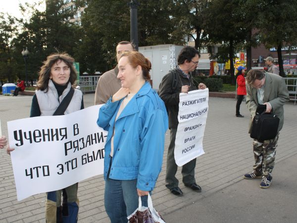 Участники держали транспаранты следующего содержания: "22 сентября 1999 — "рязанские учения" ФСБ и день недоверия", "Юрий Щекочихин, Александр Литвиненко — убиты тем, кто расследовал взрывы домов 1999 года". Также у пикетчиков были плакаты "Рязанские "учения" — провал российских спецслужб", "Учения в Рязани — что это было?", "Разжигатели национальной вражды — враги России".