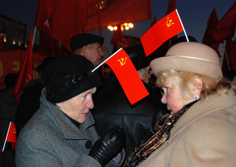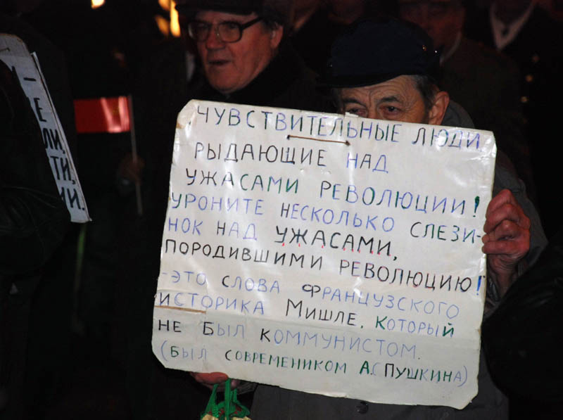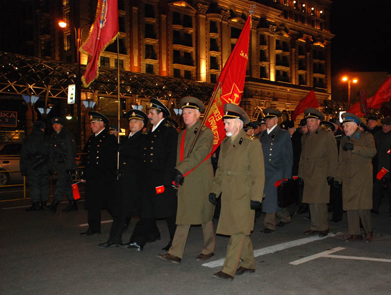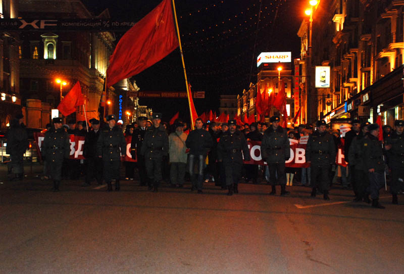 По ходу движения от Пушкинской площади до Театральной площади, где около памятника Карлу Марксу состоялся праздничный митинг-концерт, коммунисты скандировали: "Буржуев на нары, рабочих на Канары", "Ленин, партия, комсомол", "Ленин – революция, Сталин – победа", "Земля - крестьянам, фабрики – рабочим". Многие держали советские флаги и портреты Владимира Ленина и Иосифа Сталина.