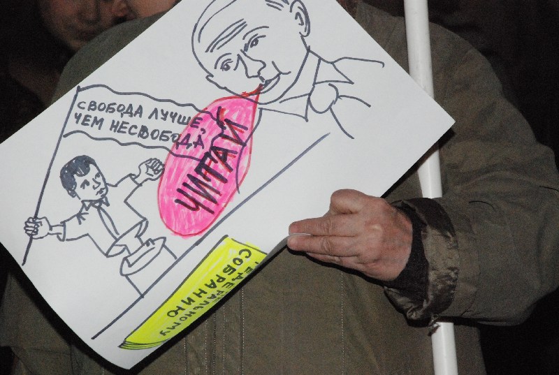 Участники пикета также держали плакаты: "Защитим Конституцию от узурпаторов", "Нет увеличению президентских полномочий", "Медведева и Путина под суд", "Народу России — ответственную власть", "Нет узурпации власти". "Хватит лжи, хватит крови, хватит Путина" и другие.