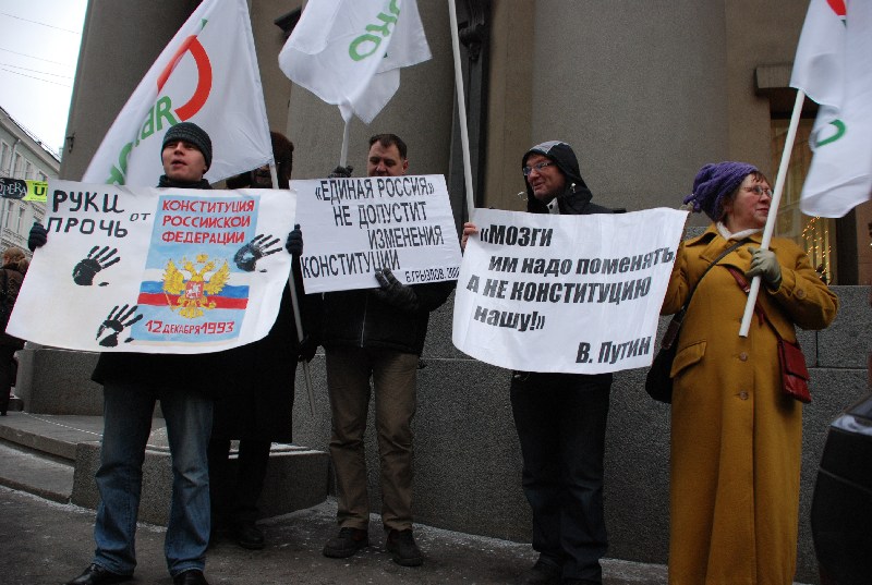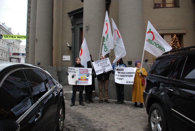 "Яблочники" скандировали лозунги: "Продление — плохо, позор депутатам!", "Меняй мозги, а не Конституцию" и "Поправки в Конституцию — это проституция!"