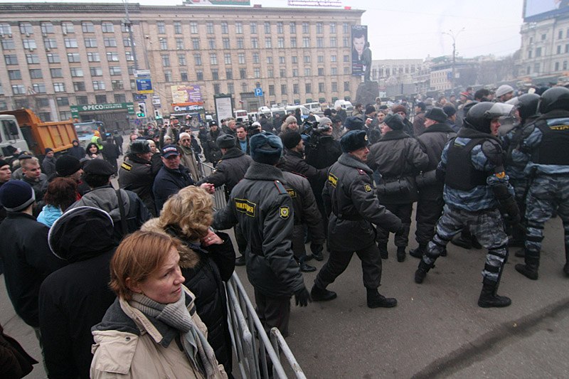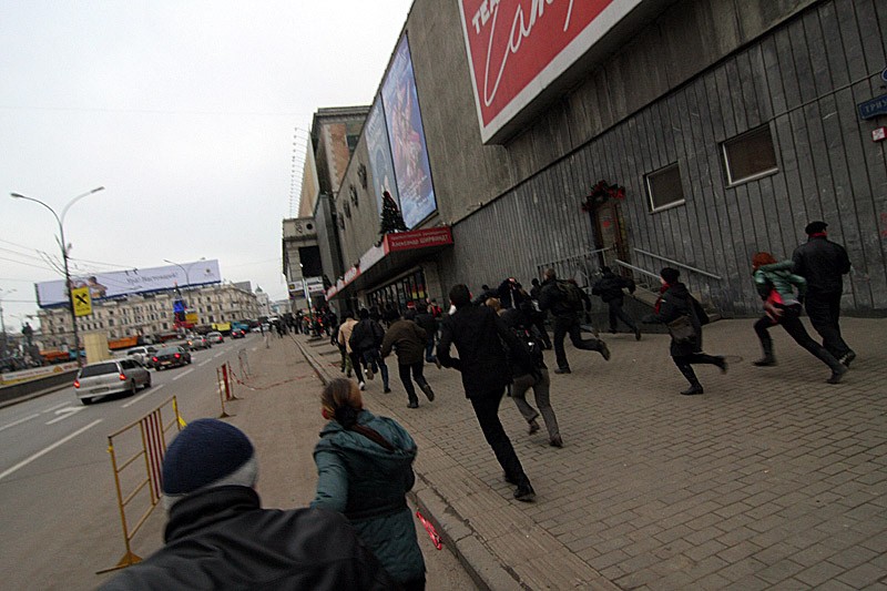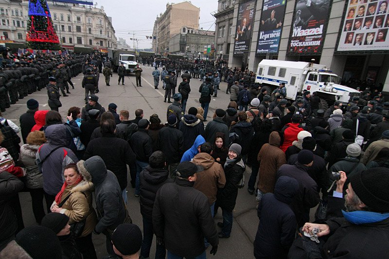 В нескольких сотнях метров находилась Триумфальная площадь, где, собственно, и был объявлен сбор "несогласных". Еще с ночи ее огородили в два-три ряда: металлическими барьерами, солдатами внутренних войск, шеренгами милиции. Тверскую с обеих сторон укрепили автозаками, настолько плотно стоящими друг к другу, что напоминало это все крепостную стену. Кроме этого, вдоль и поперек улица была заставлена самой разной техникой: эвакуаторами, поливальными машинами, милицейскими автобусами и "Газелями". Цепочка машин тянулась в сторону Пушкинской площади насколько хватало зрения. Тут и там шныряли "люди в штатском", которые были бы, пожалуй, менее заметны, нарядись они в клоунские костюмы. Может быть, их выдавало нескрываемое выражение собственной значимости на лицах и преобладающий черный цвет в одежде. По крайней мере, милиция "своих" вычисляла, видимо, по этим признакам.