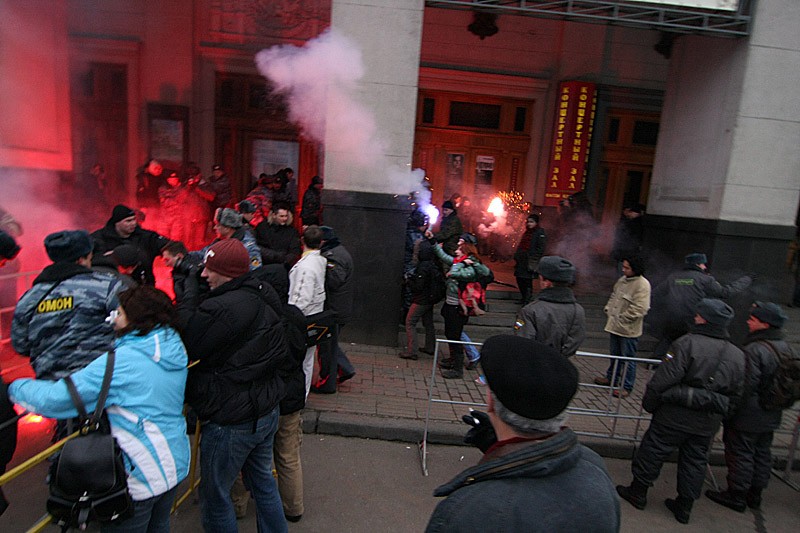 "Так, что вы здесь делаете?" – сурово обратился человек в милицейской форме к фотокорреспонденту Каспаров.Ru. "Работаю", – спокойно и многозначительно ответил тот. Милиционер уважительно кивнул и отошел. В это же время немного поодаль омоновцы, подхватив под руки, уводили мужчину с журналистским удостоверением.