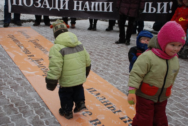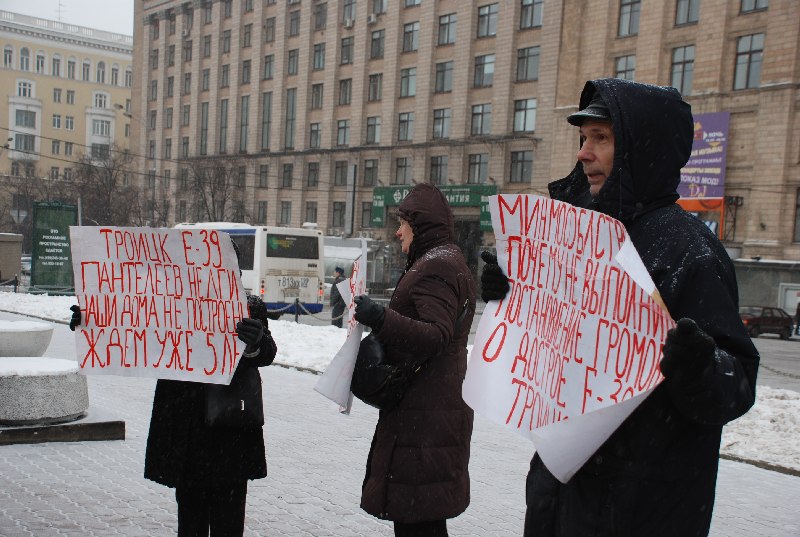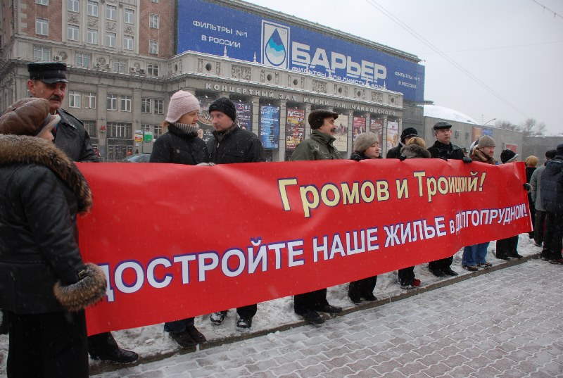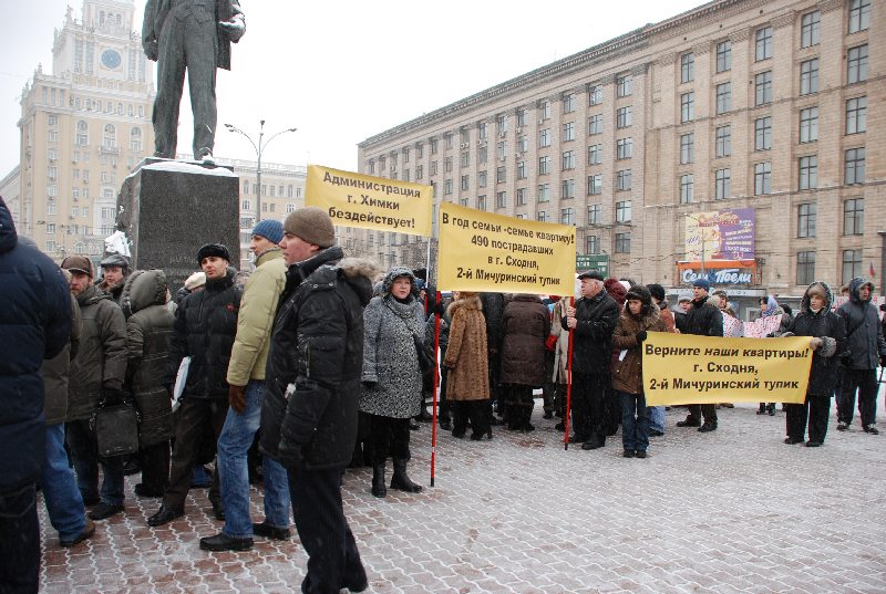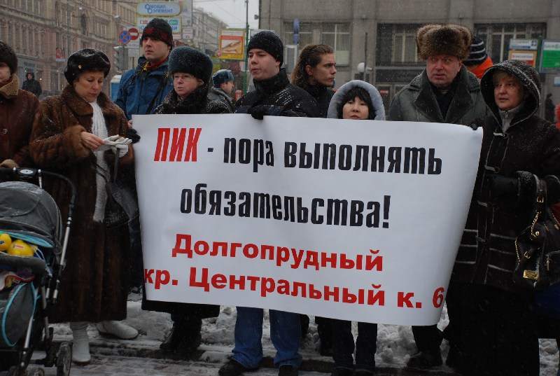 В акции приняли участие около 150 дольщиков из подмосковных Химок, Сходни, Одинцова, Юбилейного, Домодедова, Троицка, Долгопрудного, Дедовска, а также из поселка Челюскинский. Участники держали плакаты: "Громов и Троицкий! Достройте наше жилье в Долгопрулном!", "Администрация г. Химки бездействует!", "В год семьи — семье квартиру! 490 пострадавших в г.Сходня, 2й Мичуринский тупик", "Пол тысячи бомжей в Долгопрудном!", "Соинвесторам нужны гарантии на получение оплаченного жилья", "Жилой комплекс "Лесная корона" — позор Министерства обороны" и другие.