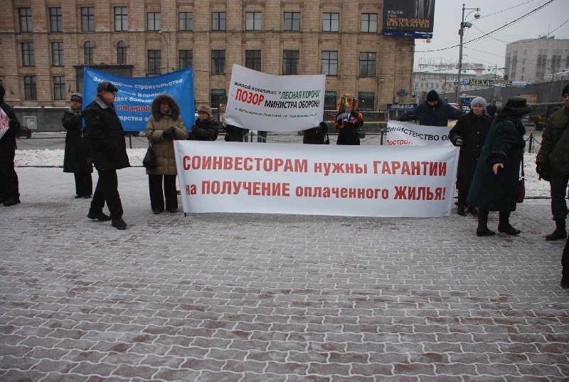 Так, корреспонденту Собкор®ru представтель инициативной группы жилищного комплекса "Лесная корона" в Юбилейном рассказал, что заказчик - Министерство обороны - в течение 5 лет не выполнило своих обязательств перед инвестором. По его словам, из вложенных в строительство 30 миллионов долларов, 20 было разворовано. Пострадавший дольщик обвинил в этом Министрество обороны. "Новый министр обороны Анатолий Сердюков саботировал решение этого вопроса и сейчас у дольщиков "Лесной короны" есть персональные претензии именно к нему", - отметил соинвестор.