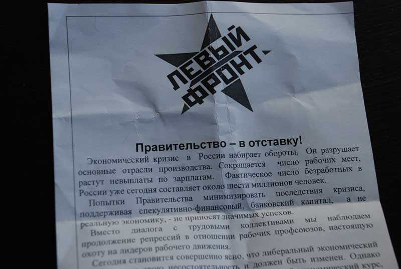 Участники шествия с зажжеными файерами и растяжкой "Уволить - правительство!" прошли от памятника Жукова до Лобного места. Они скандировали антиправительственные лозунги, в том числе "Уволить правительство, защититить рабочих!". Протестующие разбрасывали по площади листовки, в которых изложили свои требования: уволить правительство, защитить рабочих, прекратить преследования рабочих профсоюзов.