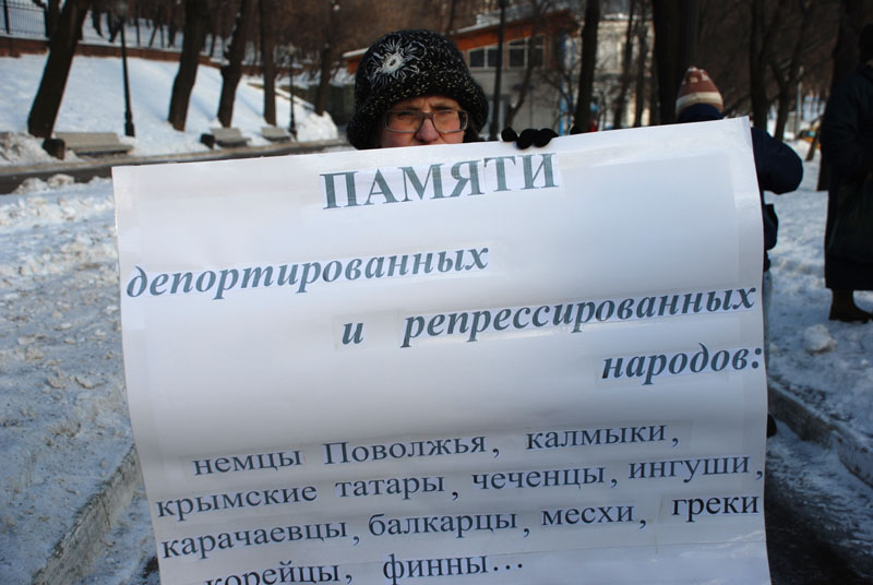 В Москве напротив Центра Андрея Сахарова состоялся пикет, посвященный памяти депортированных и репрессированных в годы правления Сталина народов. Об этом сообщил корреспондент Каспаров.Ru с места событий.