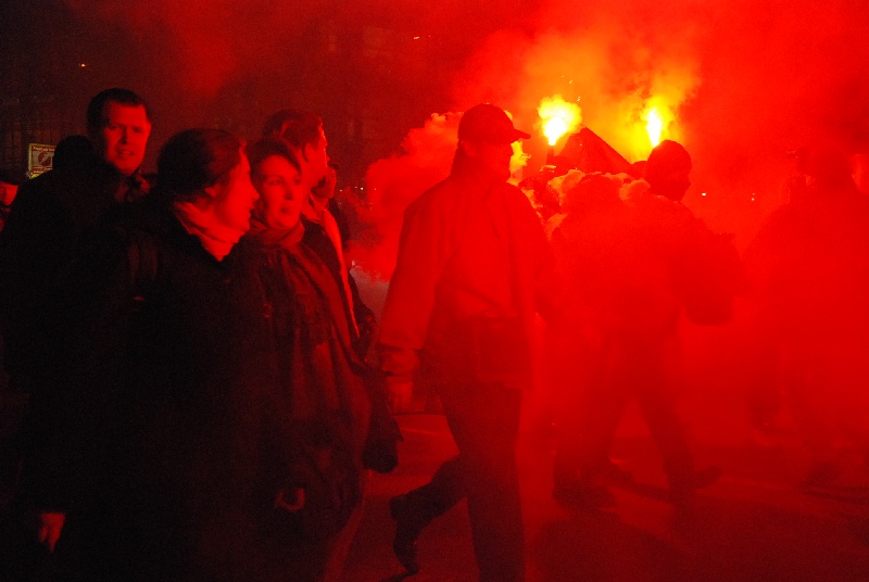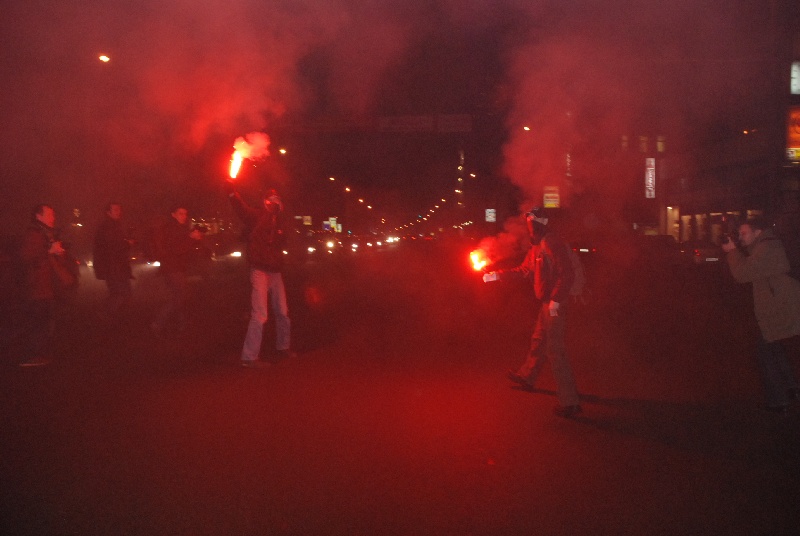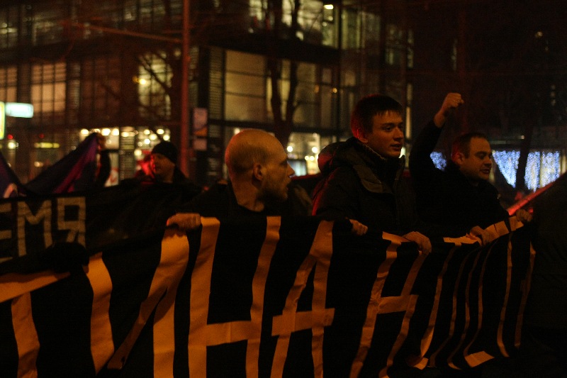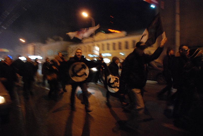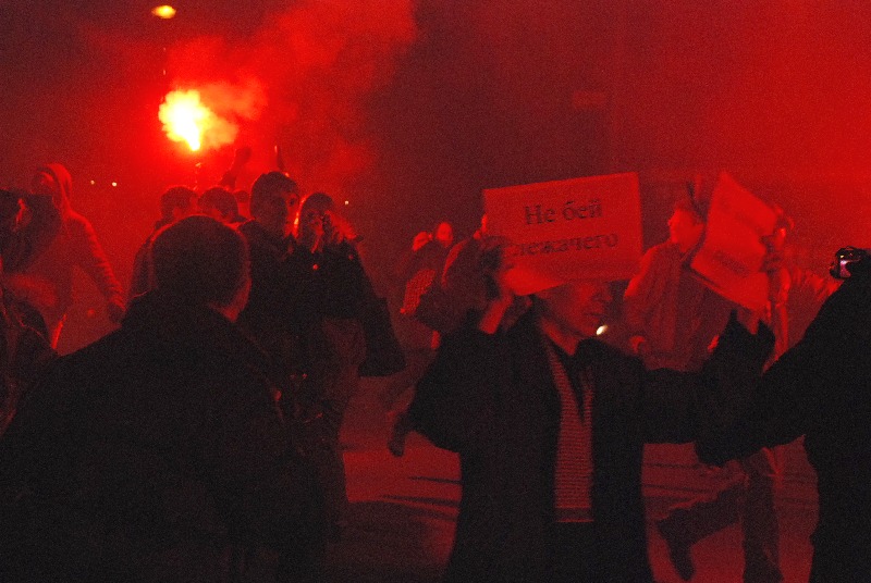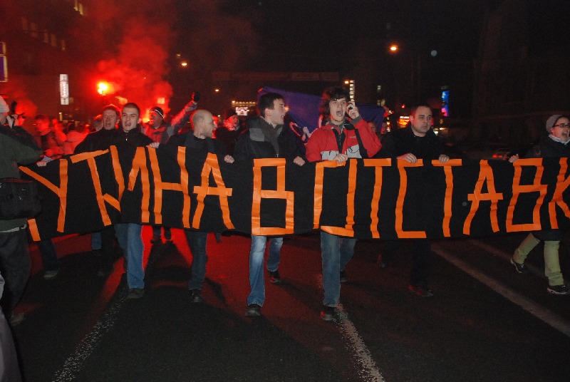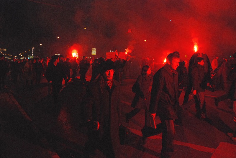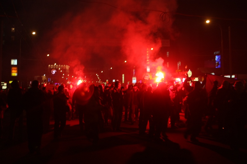 Около двухсот участников шествия скандировали: "Свободу политзаключенным!", "Нам нужна другая Россия!", "Россия без Путина!". Они несли флаги ОГФ, "Обороны", "Смены" и других оппозиционных движений, а также растяжку "Путина в отставку". По дороге они зажгли файеры и сожгли портрет президента России Дмитрия Медведева.