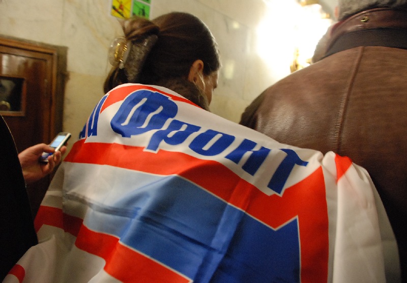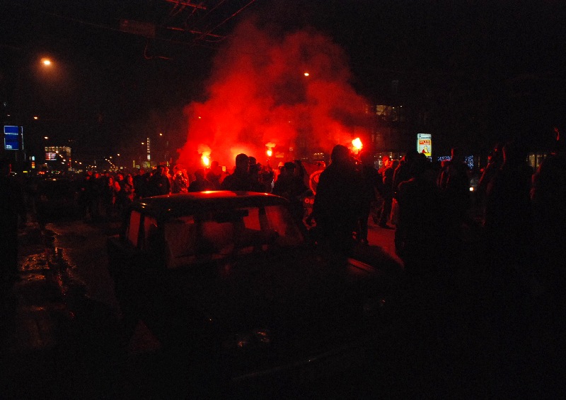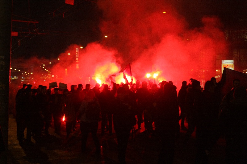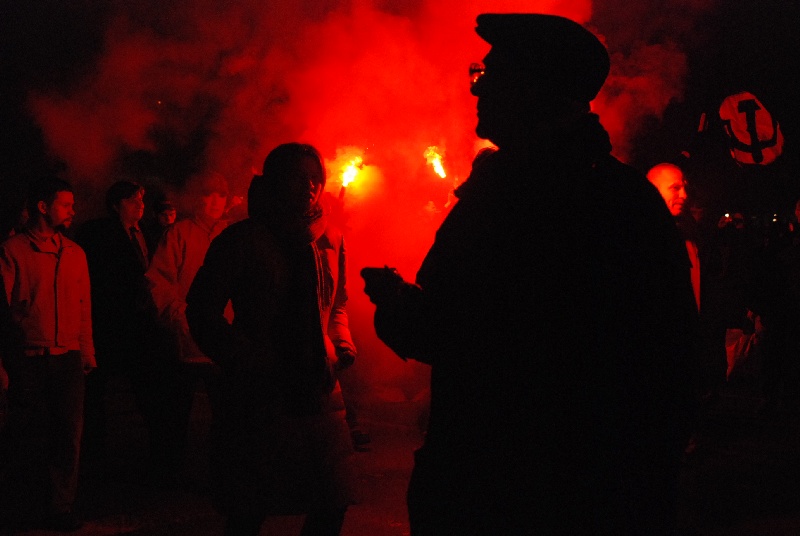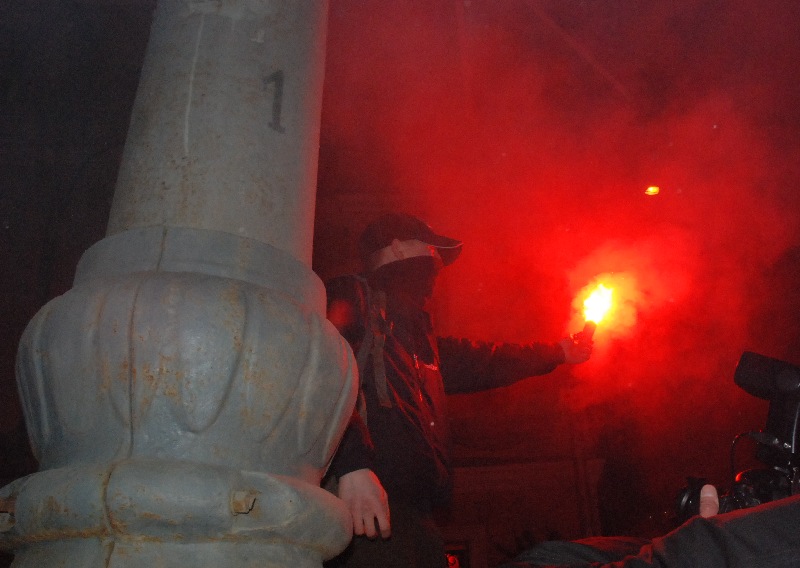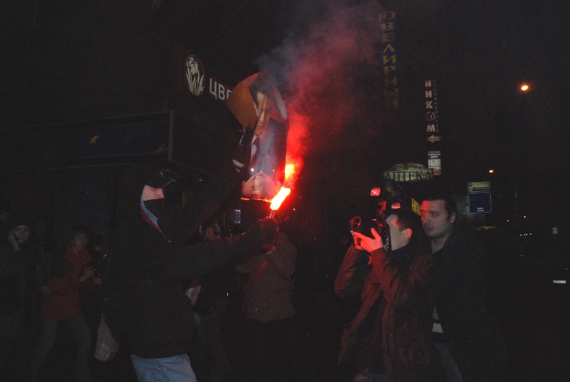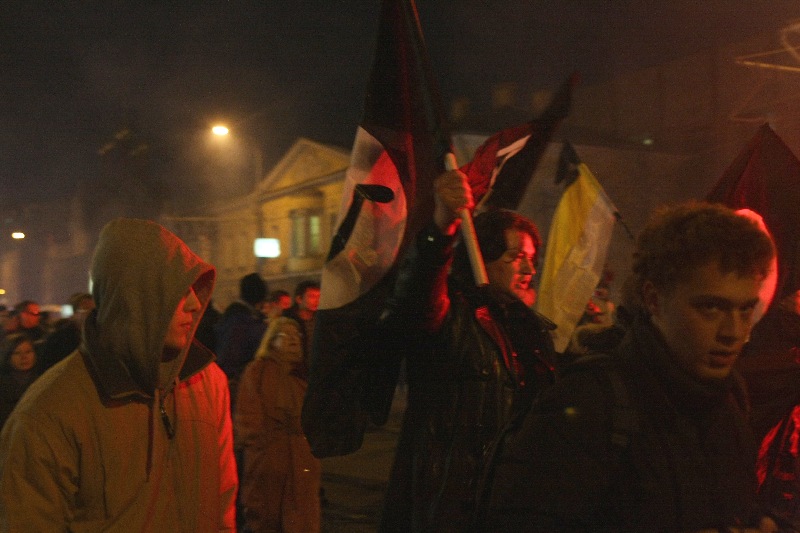 Около двухсот участников шествия скандировали: "Свободу политзаключенным!", "Нам нужна другая Россия!", "Россия без Путина!". Они несли флаги ОГФ, "Обороны", "Смены" и других оппозиционных движений, а также растяжку "Путина в отставку". По дороге они зажгли файеры и сожгли портрет президента России Дмитрия Медведева.