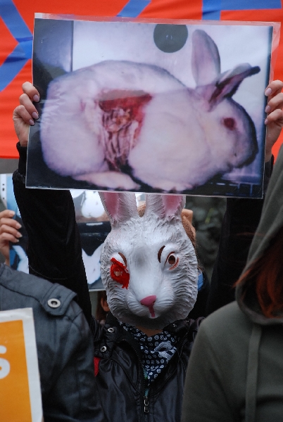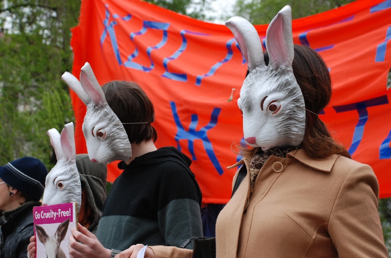 "Фэйри" купил — животное убил!" — с таким лозунгом выступили зоозащитники на пикете против тестирования косметики и бытовой химии на животных 16 мая в Москве. Об этом сообщил корреспондент Каспаров.Ru.