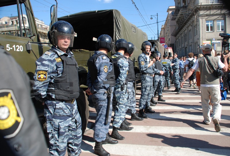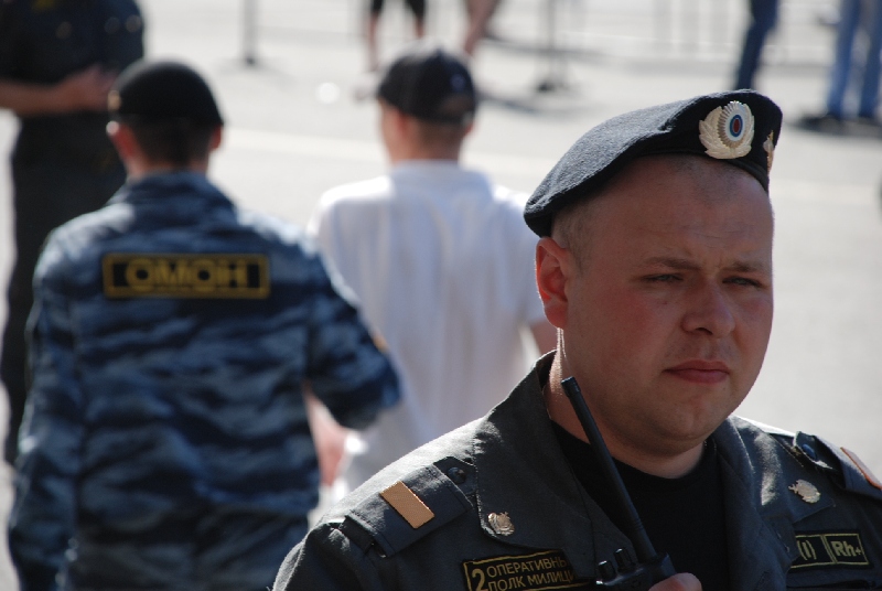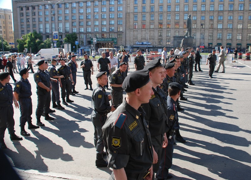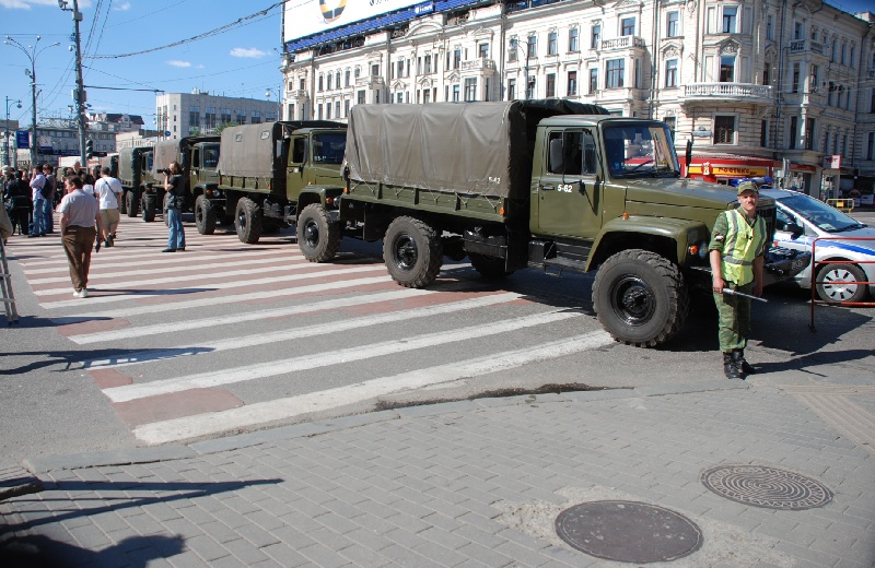 Площадь патрулировали отряды ОМОНа и сотрудники в штатском. По периметру были припаркованы более 15 военных грузовиков и несколько автобусов с милицией.