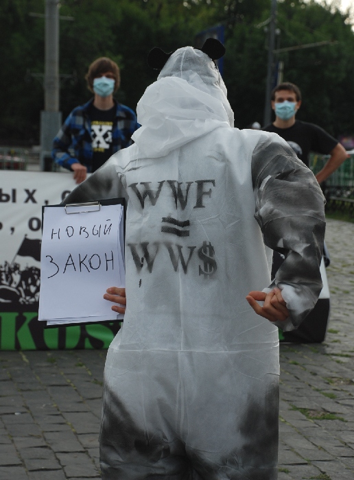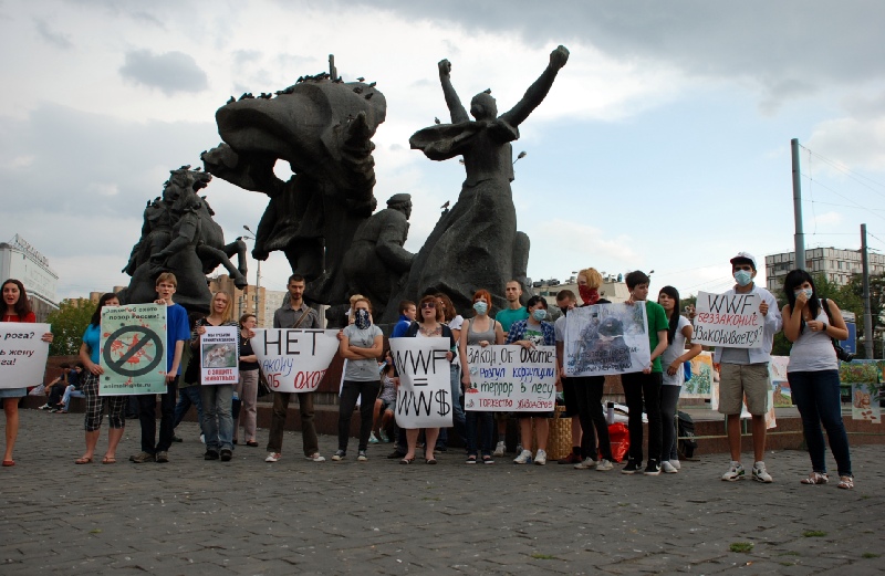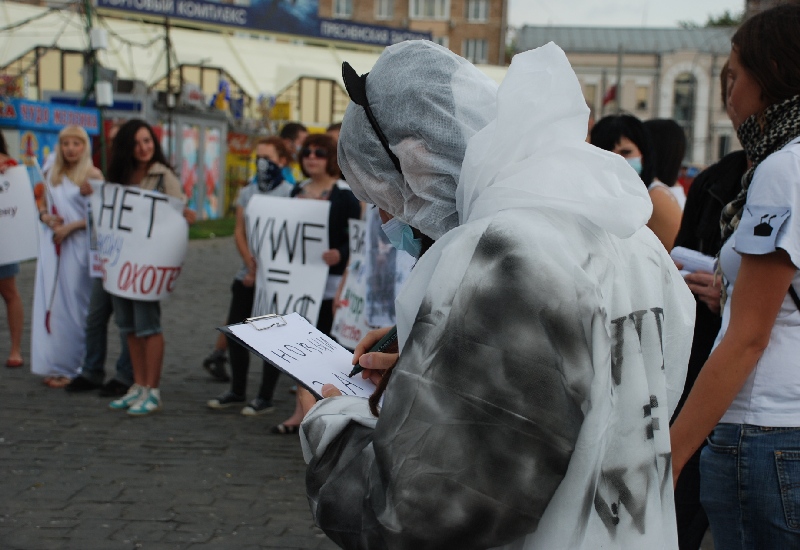"Всем известно, что WWF – организация, которая собирает деньги на охрану дикой природы, в тоже время специалисты фонда приняли участие в подготовке варварского закона "Об охоте", поэтому сегодняшнняя акция в том числе и против WWF", - рассказала член Альянса за права животных Эмилия Надин.