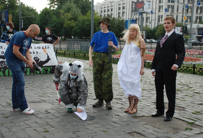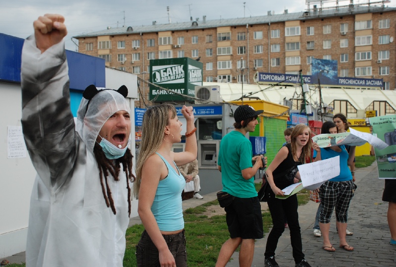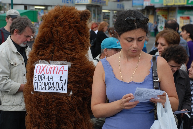 Они скандировали: "Закон "Об охоте" — торжество живодеров", "Нет террору в лесу", "Страсть к убийству не повод для гордости", "Охота — война с природой", "Закон "Об охоте" — позор России". Участники акции держали плакаты: "WWF = WW$", "Фашисты тоже любили фотографироваться со своими жертвами", "Права животных, свобода людей — один путь, одна борьба" и другие.