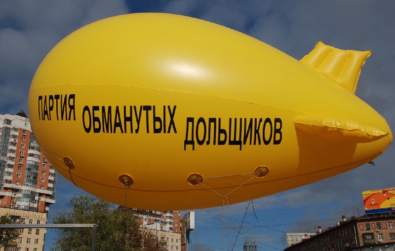 Во время митинга около 150 обманутых соинвесторов выпустили в небо воздушные шары, символизирующие улетающие надежды. Более тысячи семей, которые купили квартиры в десяти домах "Солнцеграда", остались без крыши над головой.