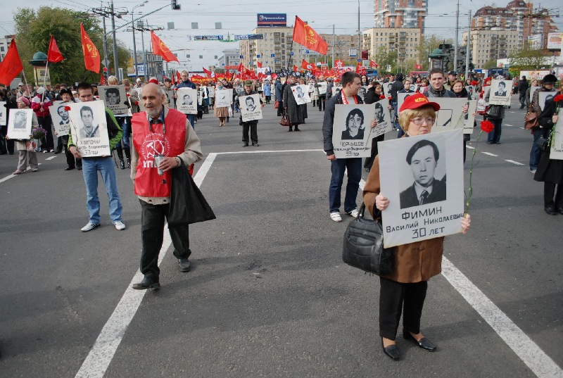 После митинга участники двинулись шествием по улице Красная пресня в сторону Горбатого моста. Колонну возглавили люди с портретами погибших. Люди выкрикивали: "Вся власть советам", "Наша родина СССР", "Не забудем, не простим", "Слава героям, смерть палачам", "Правительство в отставку" и другие лозунги.