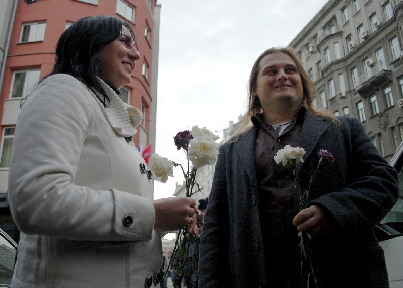 Восемь активистов, среди которых были представители движения "Оборона", написали депутатам поздравительное письмо и принесли к зданию мэрии цветы.