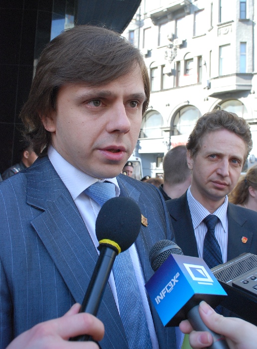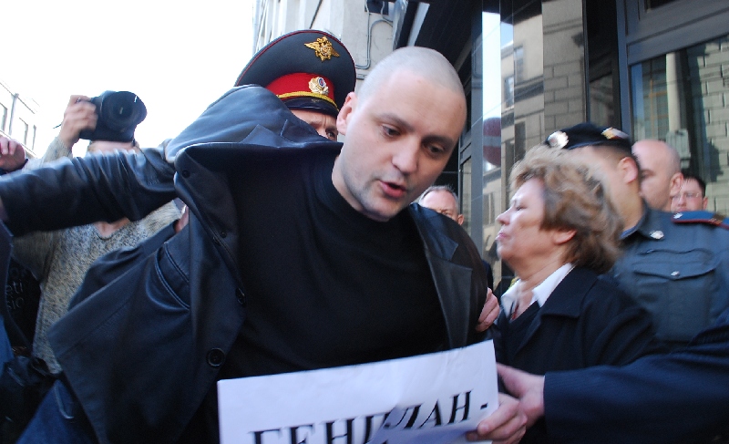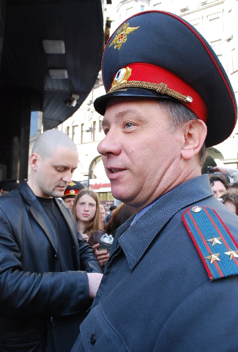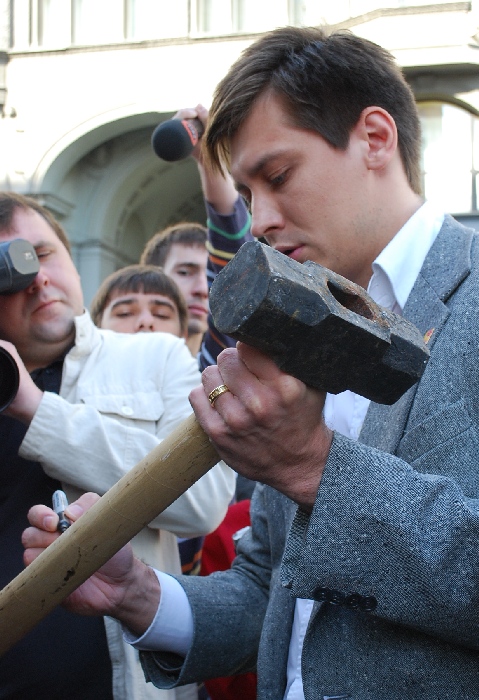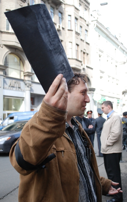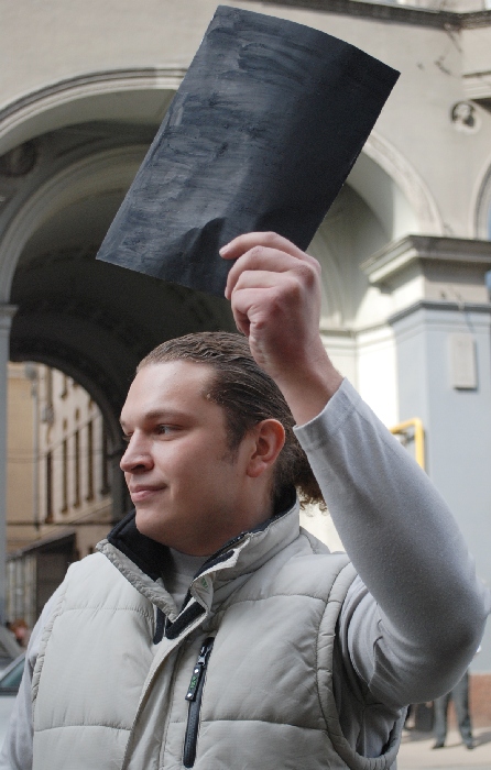 Он взял "черную метку" (черный лист бумаги формата А4) у одного из участников и пронес ее в здание Мосгордумы для того, чтобы передать ее председателю столичного парламента Владимиру Платонову.