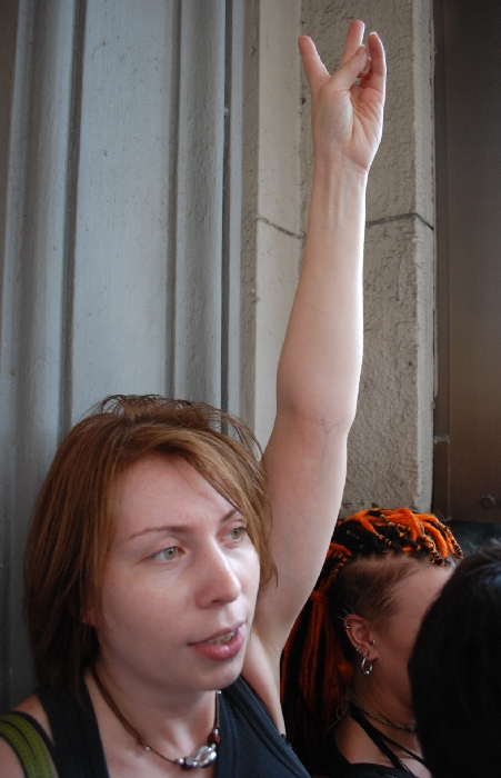 В ОВД Красносельский привезли 9 из 10 активистов, которые вдесятером сцепились наручниками, сообщила Каспаров.Ru одна из участниц акции Вера Кичанова. По ее словам, с ней в автозаке приехали активисты "Войны" Петр Верзилов и Надежда Толоконникова, Михаил Браиславский и Анастасия Рыбаченко из "Солидарности", художники из Новосибирска Артем Лоскутов и Мария Киселева, а также активист Сергей Ерошкин.