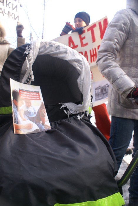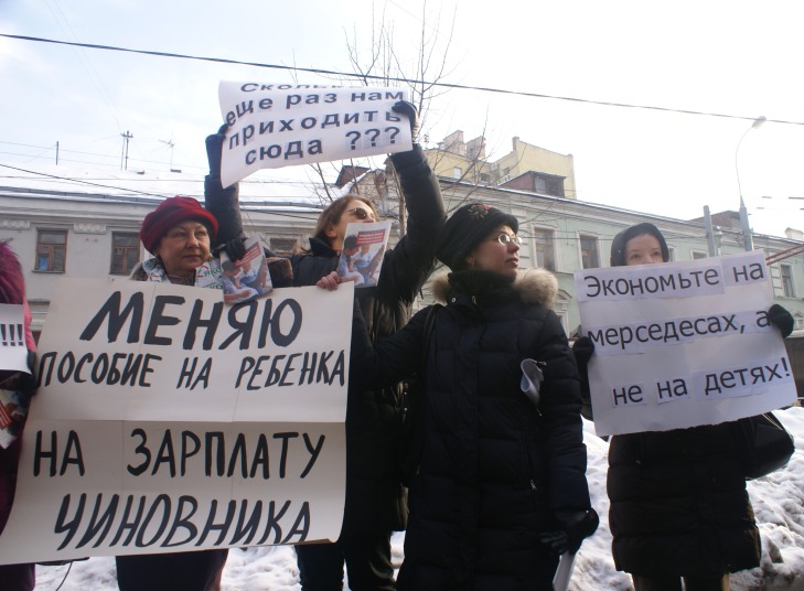 На пикет участницы пришли с плакатами: "Дети - не бюджет, так легко не планируются", "2011 - последний год роста рождаемости?", "Меняю пособие на ребенка на зарплату чиновника", "Экономьте на Мерседесах, а не на детях". Первоначально участники пикета собралисьу входа в здание министерства, однако спустя примерно 20 минут переместились в сквер на Неглинной улице. Выяснилось, что место согласованного пикета находится именно там.