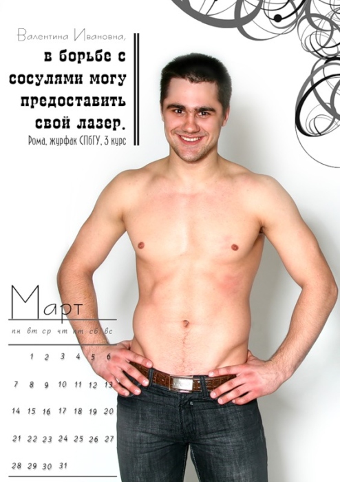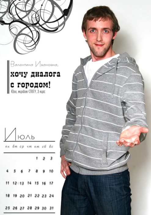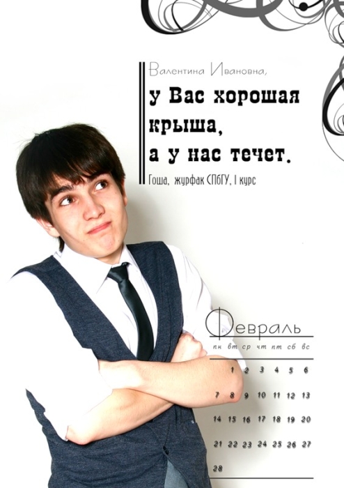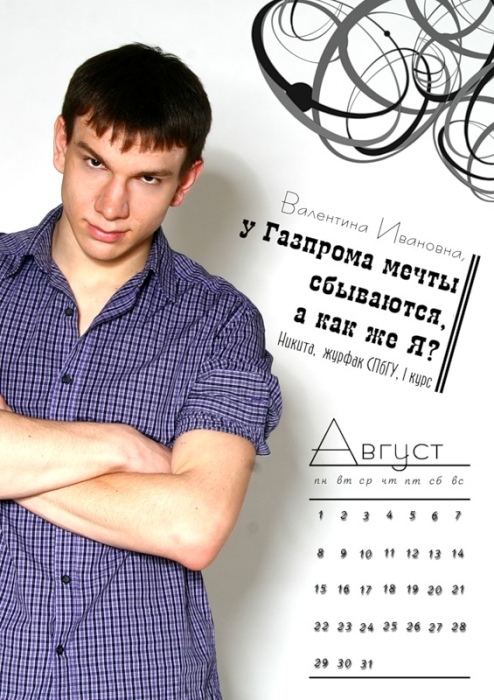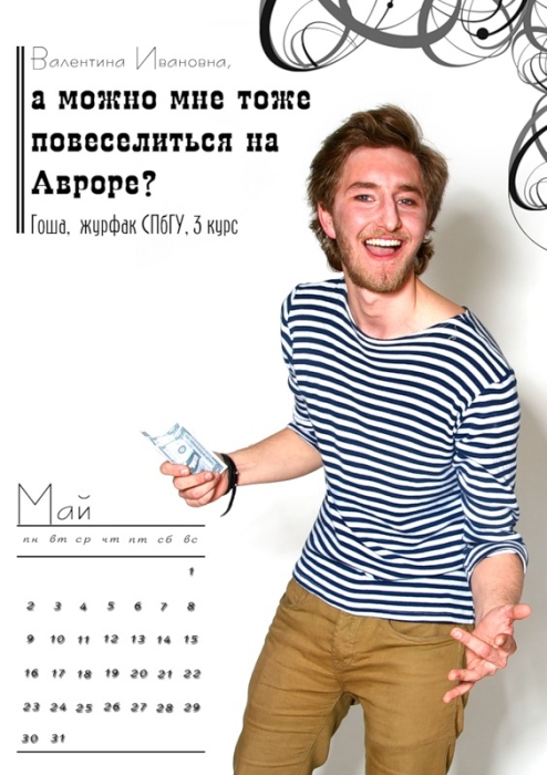 "У Газпрома мечты сбываются, а как же я?", "Я студент-бомж готов убирать снег", "А можно мне тоже повеселиться на Авроре", — обращаются студенты со страниц календаря к Матвиенко.
