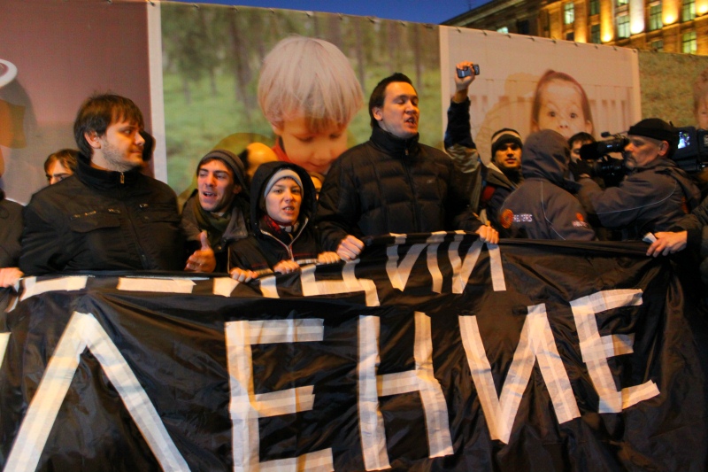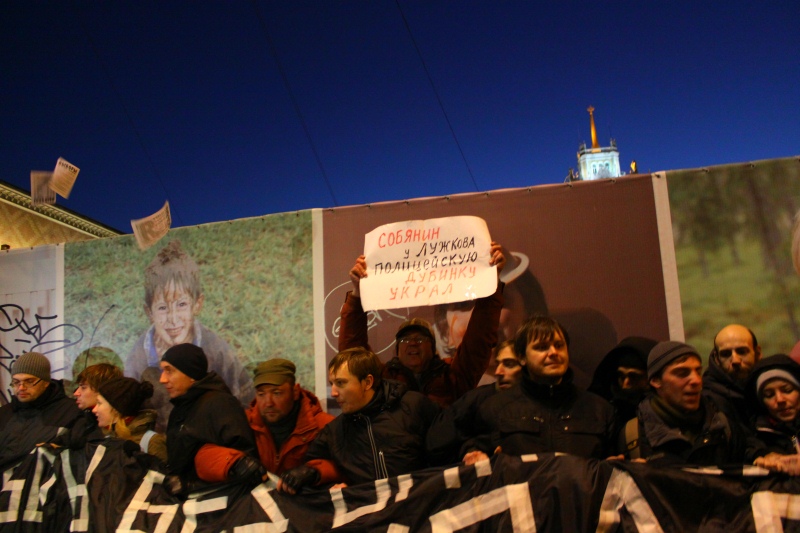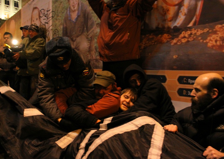 Полиция начала задержания как только оппозиционеры растянули плакат "Выборы без оппозиции — преступление". Участники акции также разбросали листовки с текстом "Я положил на выборы!" и скандировали лозунги.